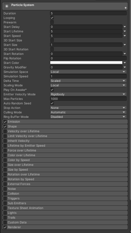 - Prewarm : 체크하면 파티클 시스템이 한 번 동작을 완료한 상태부터 Loop